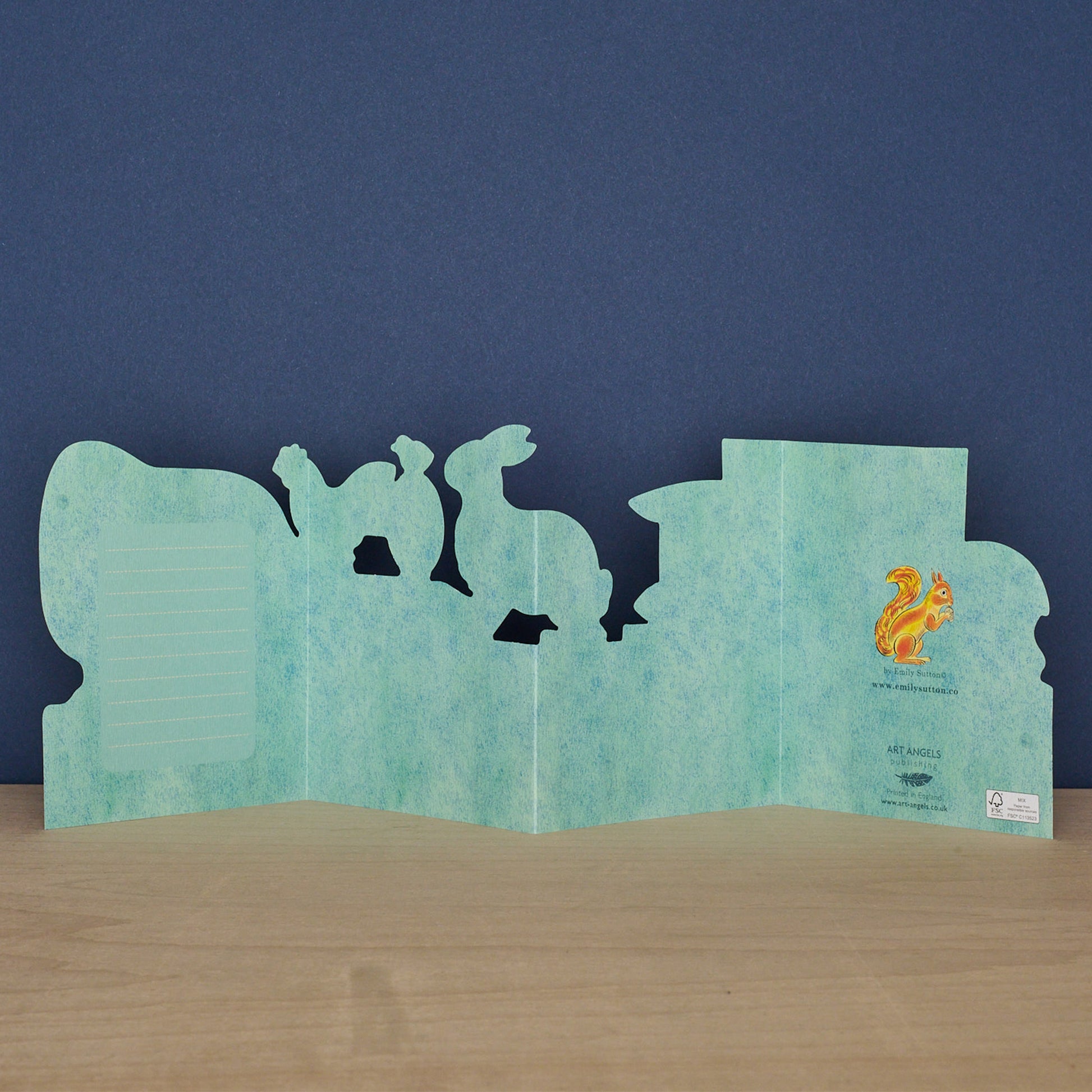 The die-cut cards are 148mm x 210mm, they are packed with an envelope in a biodegradable cello sleeve.